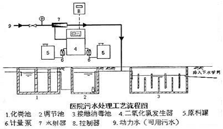 ●二氧化氯應用於(yú)醫院污水的殺菌消毒的處(chù)理工藝流程圖如下所示: